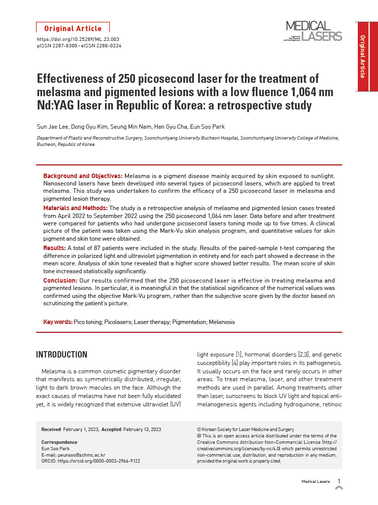 Effectiveness of 250 picosecond laser for the treatment of melasma and pigmented lesions with a low fluence 1,064nm NdYAG laser in Republic of Korea
