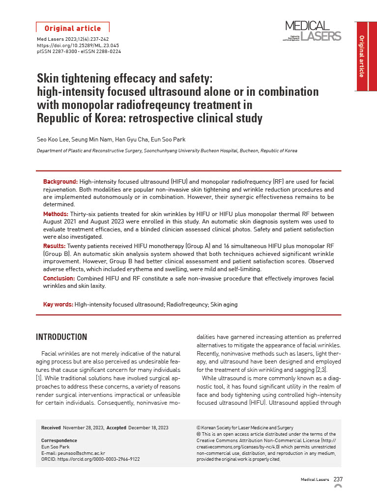 Skin tightening effecacy and safety high-intensity focused ultrasound alone or in combination with monopolar radiofreqeuncy treatment in Republic of Korea